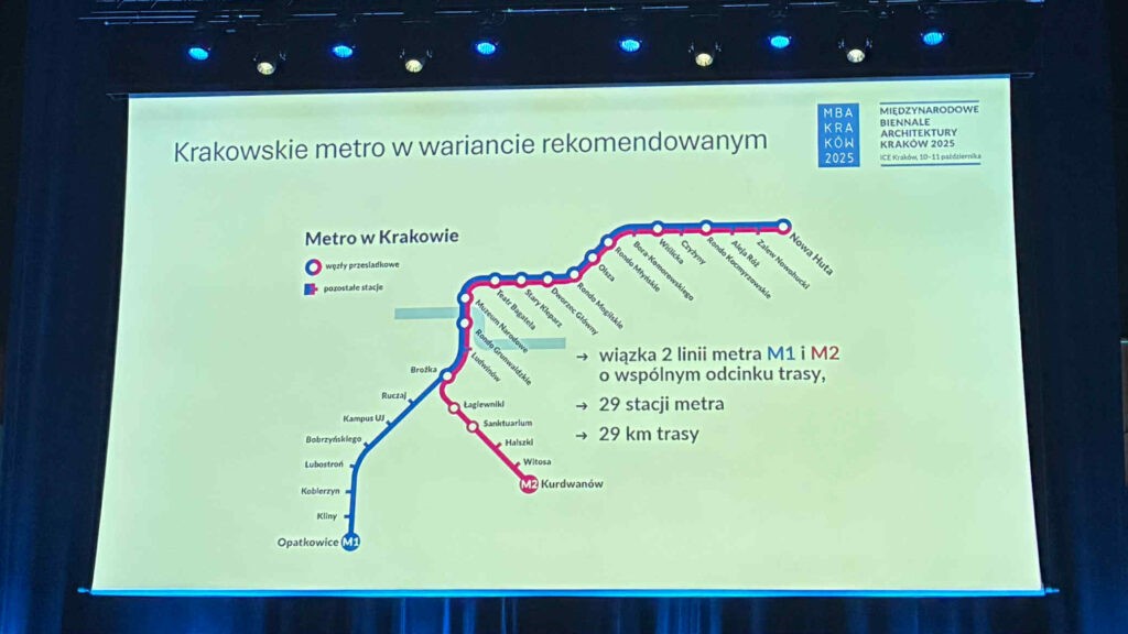 W ten weekend miałam okazję spontanicznie uczestniczyć w Biennale Architektury Kraków 2025. Jest to wydarzenie, które odbywa się co rok (jak się okazuje od 40 lat…) i jest bezpłatne. W ICE przy Rondzie Grunwaldzkim można było uczestniczyć w panelach i jeden z nich był dla mnie tak ciekawy, że aż postanowiłam go Wam streścić. Mówię o metrze. Wiadomo, że jest to temat, który wszystkich grzeje, bo w kółko się o nim gada, a metra jak nie było, tak nie ma. Najciekawsze było dla mnie wystąpienie prof. dr hab. inż. Andrzeja Szarata, rektora Politechniki Krakowskiej i zarazem przewodniczącego komisji ds. metra. Już we wstępie powiedział, że o metrze w Krakowie zaczęto rozmawiać w latach 60. ubiegłego wieku. Ciekawe, czyli o metrze gadamy już ponad 60 lat;) Najważniejsze studium metra opracowała firma ILF w roku 2015, a potem cisza. To tak dla wstępu. Potem profesor Szarata przeszedł do omawiania „starej” wersji metra ze wschodu na zachód, macie to na fotce, chodzi o ten przebieg między Nową Hutą a Bronowicami, którego studium skończono w 2015.