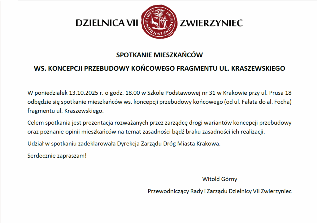 Już w ten poniedziałek 13 października odbędzie się spotkanie dla mieszkańców dotyczące przebudowy ulicy Kraszewskiego wraz z przyległym parkingiem. Na spotkaniu będą obecni przedstawiciele Rady Dzielnicy VII, przedstawiciel inwestora, urzędnicy z ZDMK. Szczegóły spotkania na grafice.