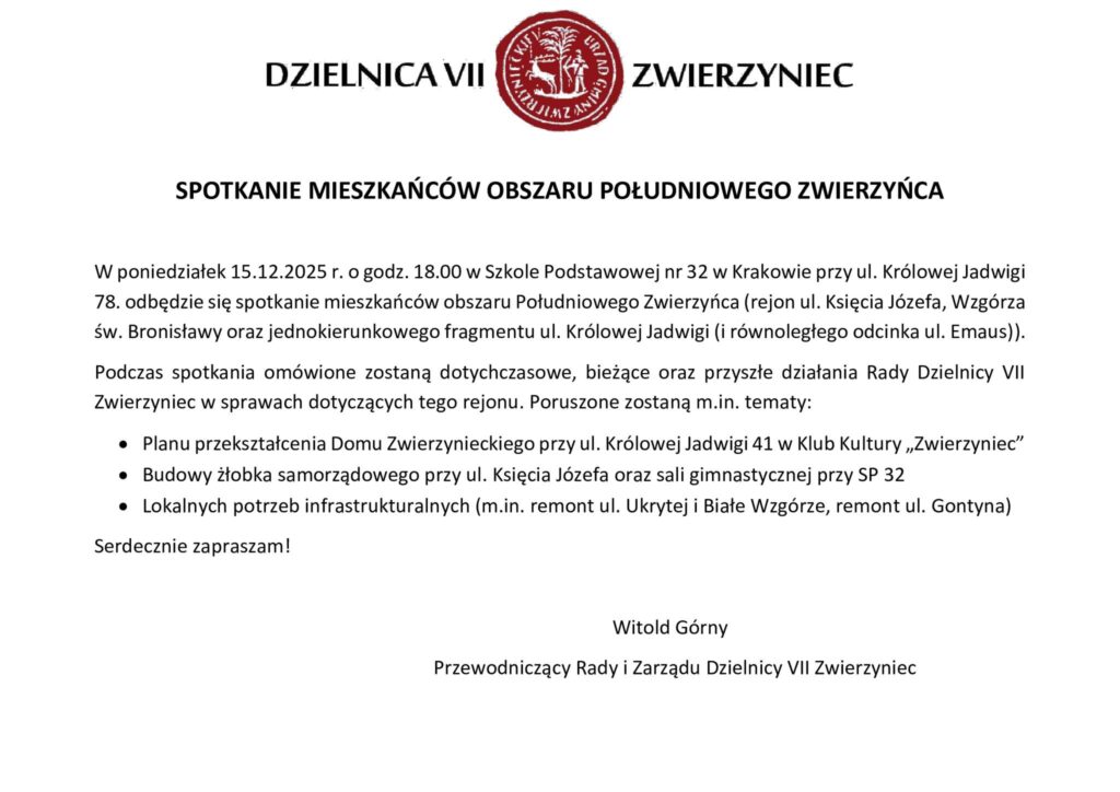 Kolejne spotkanie wypada 12 stycznia 2026 – dla mieszkańców północnego Zwierzyńca o odbędzie się w przedszkolu nr 76 przy ul. Emaus.