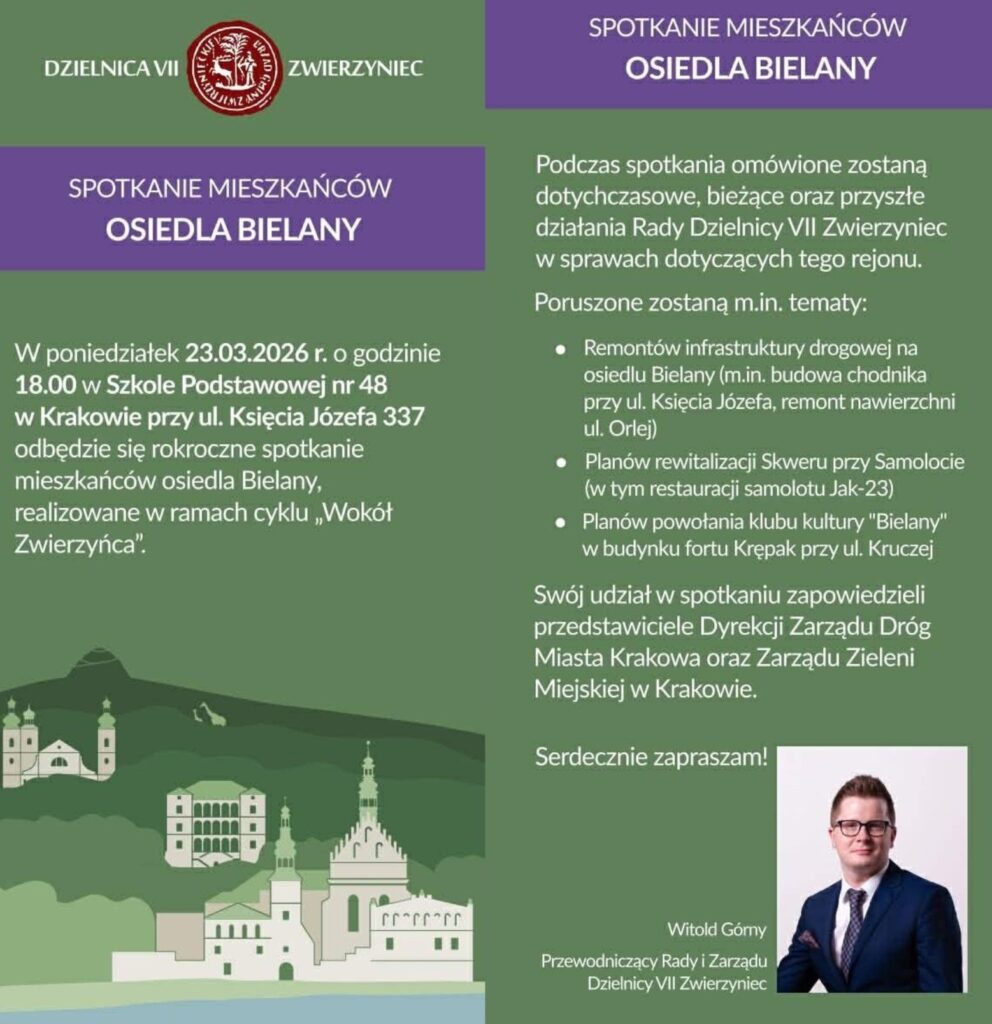 Już w poniedziałek 23 marca Rada Dzielnicy VII Zwierzyniec spotka się z mieszkańcami Bielan. Będzie można zadawać pytania, poruszać nowe tematy, a także wysłuchać co Rada zaplanowała dla naszego osiedla.